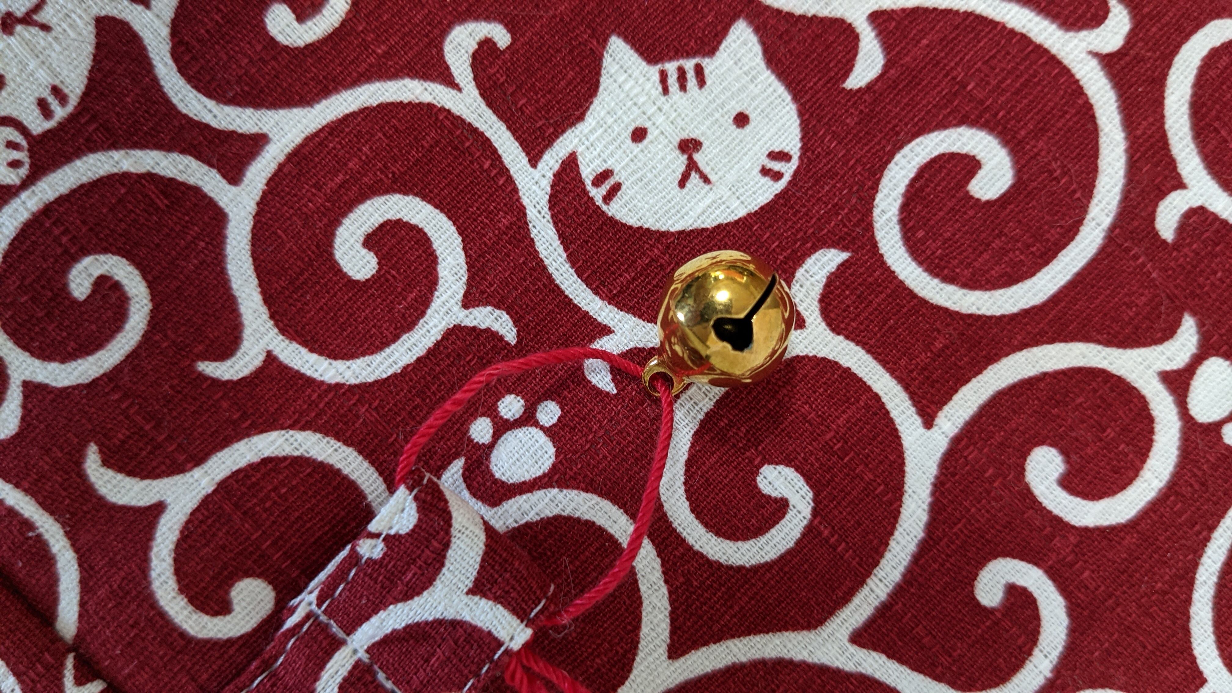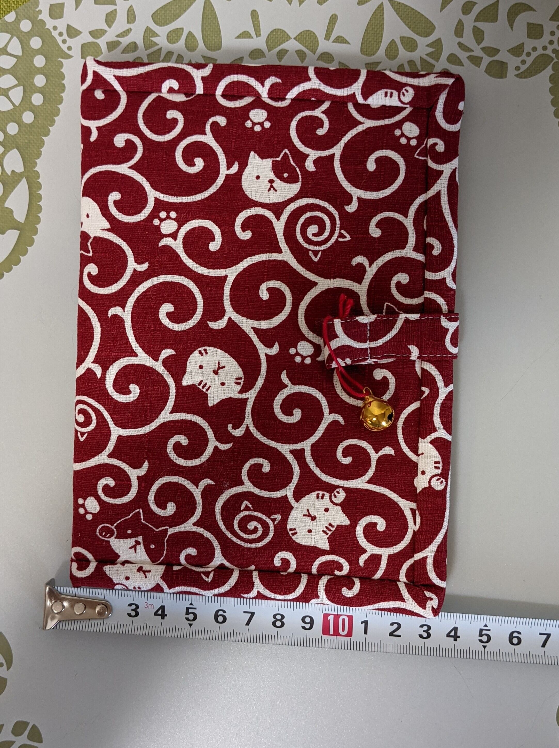 ★唐草模様に猫さんが、入っているエンジ色のお薬手帳入れです。